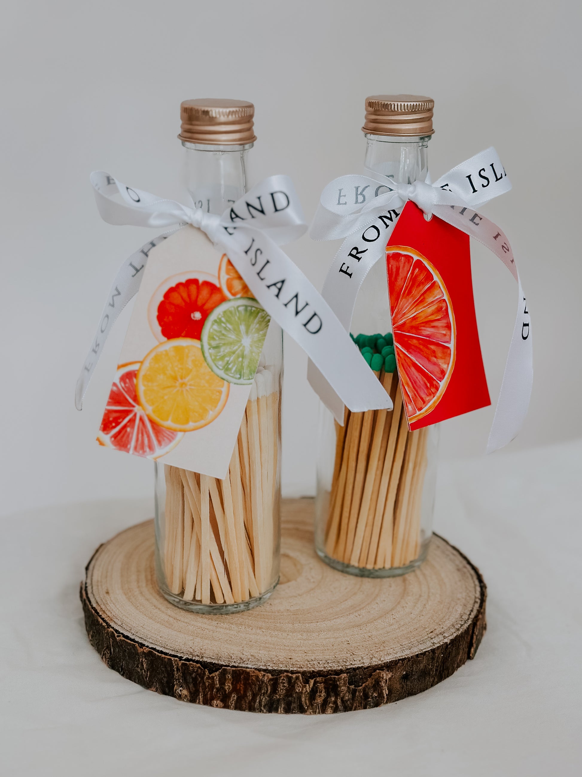 A glass bottle of 60 long matches (decorative tag may vary)